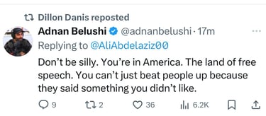 The implication: I was assaulted because I said something someone didn’t like — that’s not how it works in America.