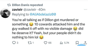 After being banned from UFC events, Dillon Danis reposted images implying he was jumped 10-on-1, walked away unharmed, and that the chaos looked staged — even comparing himself to a WWE moment. By using reposts instead of statements, he builds a defense and a marketing narrative at the same time.